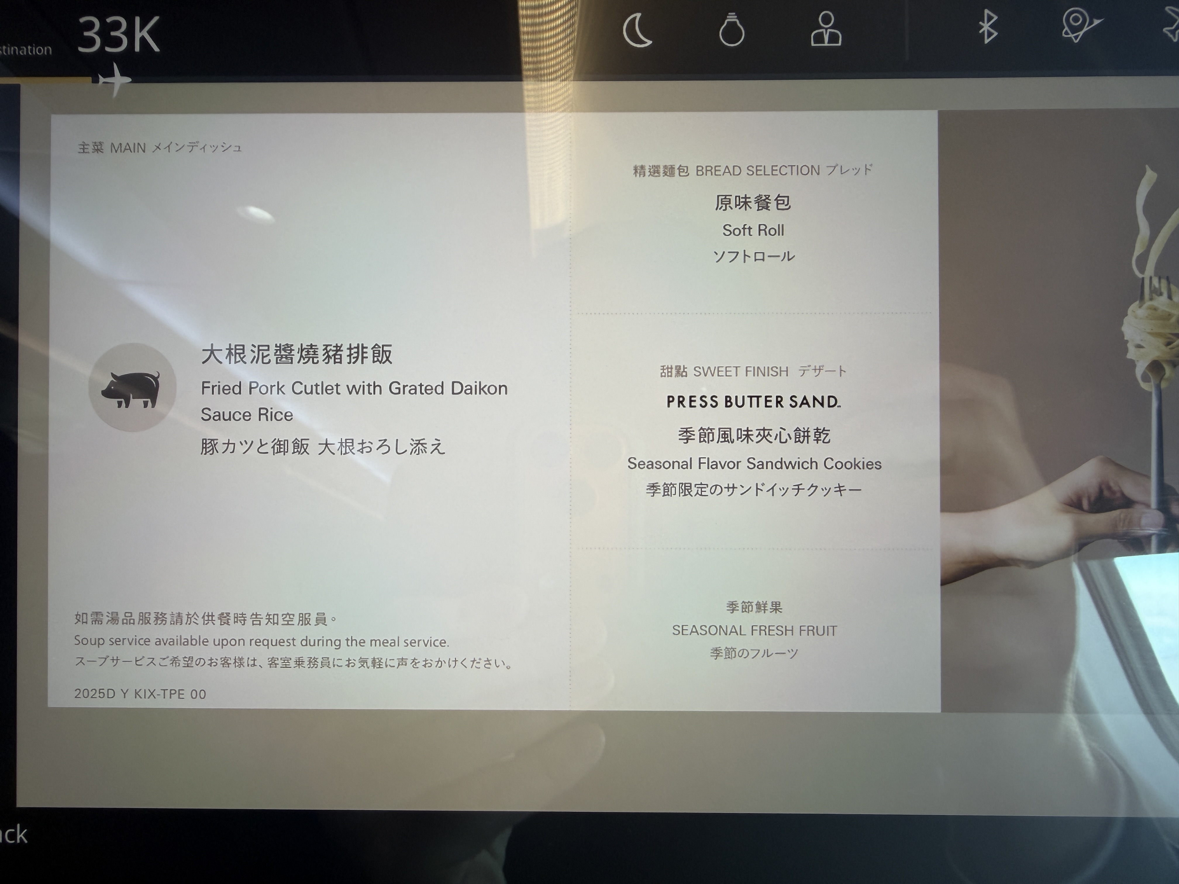 The Taipei–Osaka Premium Economy service featured a well-presented hot meal including chicken with rice, a Japanese-style chilled seaweed starter, fresh fruit, and a crème caramel dessert. Further elevating the experience was metal cutlery and china tableware. A dedicated coffee and hot beverage service followed the meal.